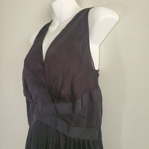 White House Black Market women's dress - midi length, metallic lurex stripes, pleated skirt, sheer chiffon, front surplice bodice, V-neckline, back keyhole, zipper closure and fully lined. Black.