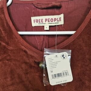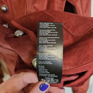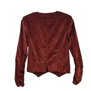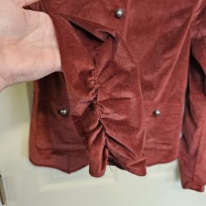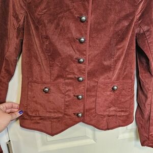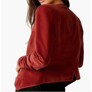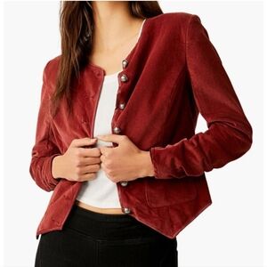Chic red blazer with metallic button accents. Tailored fit. Perfect for layering.