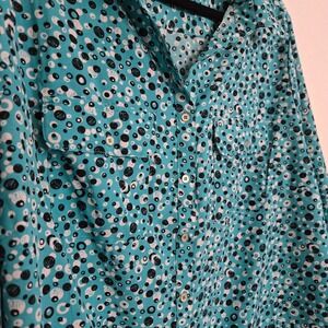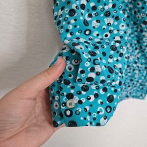Keywords: button down shirt, long sleeve top, teal blouse, circle print shirt, casual top, career blouse, womens top, collared shirt, statement top, quirky print, blouse with pockets, boho shirt, retro blouse, everyday top