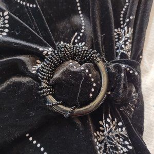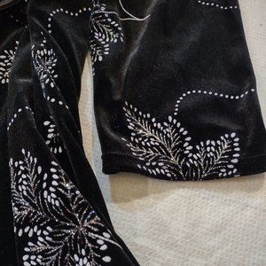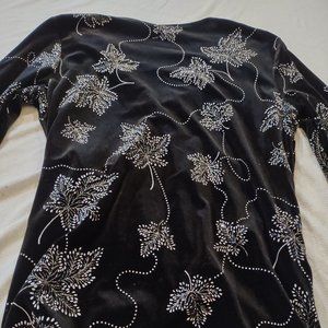NOTATIONS BLACK, SILVER, GLITTER SPARKLE LEAF PATTERN, FORMAL, VELVETEEN, SHORT SLEEVE TOP, BUTTON TWIST, WRAP STYLE, WOMAN'S SIZE MED, BUST 34 INCHES, WAIST 32 INCHES, LENGTH NECK TO HEM 24 INCHES, SLEEVES 14 INCHES (11oz)