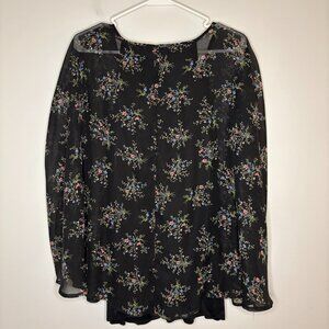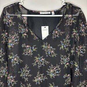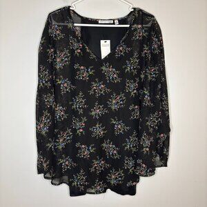 NOTATIONS NEW V-Neck Blouse Womens 2X Sheer Lined Black Floral Stretch Poncho