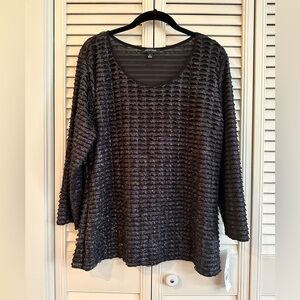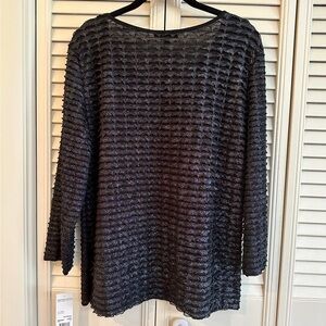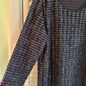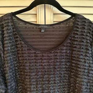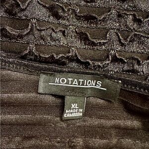 NOTATIONS, NWT, WOMENS, BLACK TOP. ROUND NECK, 3/4 SLEEVES. RUFFLY FABRIC WITH A SILVERY SHIMMER. 97% POLYESTER, 3% SPANDEX. SIZE XL