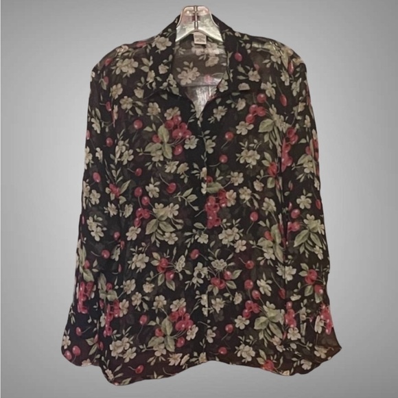 Sheer button down by Notations. Cherry and floral pattern. Flare sleeves. Measurements laying flat are approximately 26 inches long from back of neck to bottom hem, 22 inches wide from armpit to armpit. Size is XL.
