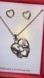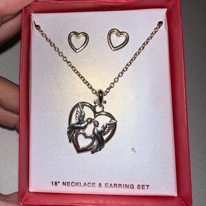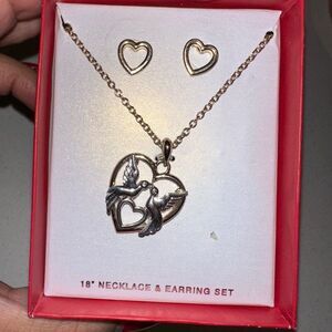 Charming necklace with heart and dove design. Includes matching earrings. Perfect for any occasion.
