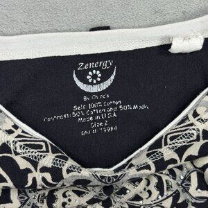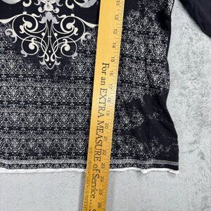 Elegant Y2K inspired Zenergy by Chico’s 3/4 long sleeve top featuring an intricate baroque scroll print in black and ivory with shimmering rhinestone embellishments for a subtle sparkle. Classy and elegant piece with a contrasting distressed white layering wrist and hem edge. Made in USA.