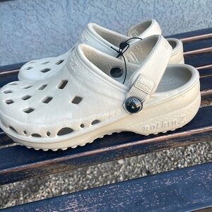 Beige Eva clogs with diamond shaped cents. Most comfortable clog you’ll ever wear and have unmatched arch support and superior styling. Made of recovery nylon that automatically forms to the shape of your foot through body activated heat, giving you a perfect fit every time! Ergonomically corrects arch, floats/waterproof, and cleans easily with soap and water.