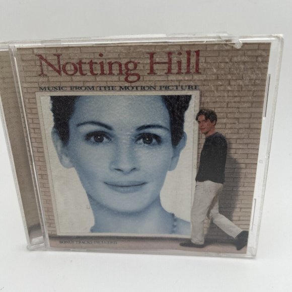 This CD features the original soundtrack of the film Notting Hill, with various artists contributing to the compilation. The jewel case is standard and the cover features a colorful design. The disc is in good (G) condition and the inlay is also in good (G) condition.
