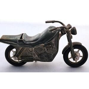 Novelty bank that is a motorcycle. I believe this is made of pewter. It has the patina of a pewter piece. This metal motorcycle stands up on the side stand. It has rubber tires that turn as does the front handlebars. The top has the coin slot in the seat. The bottom opens to release the coins. The back tail of the motorcycle looks like it has initials engraved. See last picture. They are worn and I can't read the initials as they are very light. This is in good condition - but does have a patina on the pewter that gives it some extra character.