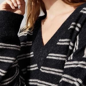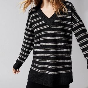 Long sleeves. Knit construction. Allover stripe print. Ribbed trim. Thumb holes. V neck