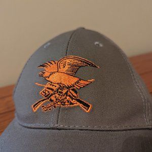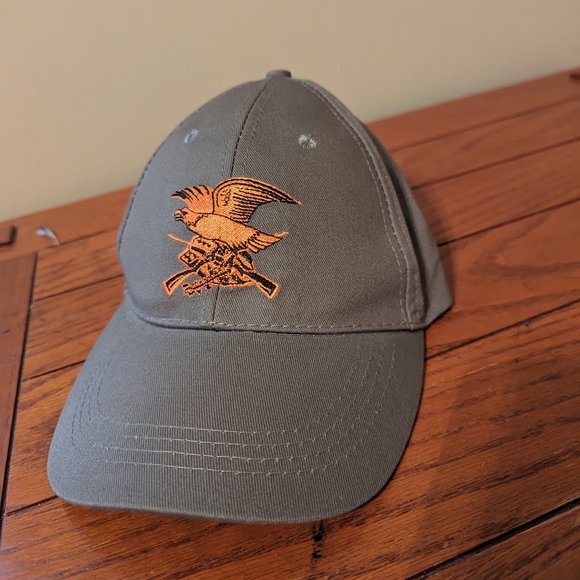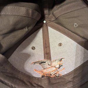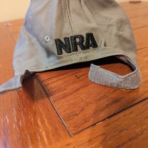 This great men's NRA hat has an orange embroidered eagle on the front with NRA embroidered on the back. Adjustable hook & loop closure. Nice khaki/olive color. EUC!