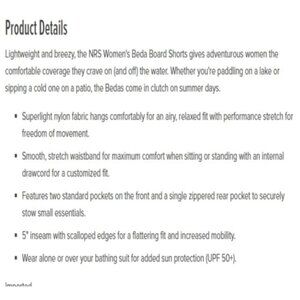 Lightweight and breezy, the NRS Women's Beda Board Shorts gives adventurous women the comfortable coverage they crave on (and off) the water. Whether you're paddling on a lake or sipping a cold one on a patio, the Bedas come in clutch on summer days.