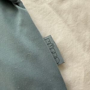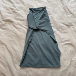 Soft and stretchy NüRoo swaddle in muted blue, designed to grow with baby. Features secure hook&loop wings for adjustable snugness and lightweight, breathable fabric. Gently used with minor wash wear; overall good condition.