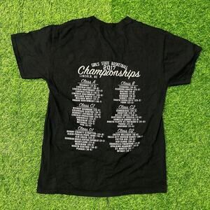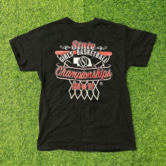 Commemorate the 2017 *NSAA State Girls Basketball Championships* with this classic tee. Featuring bold graphics of the basketball net and the tournament year on the front, this shirt is perfect for basketball players and fans alike. The back showcases the teams from different classes that competed in the championship, making it a memorable piece of sports history.