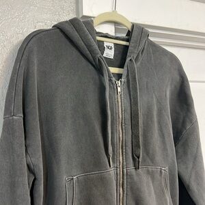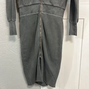 NSF Clothing jumpsuit skirt. Gray 100% cotton made in USA. So cute comfy. Size small. Had some minor oil type stains as seen in pics and small hole near bottom of zipper as seen in pic. All not super noticeable when wearing have not tried to get out oil stains. Price is reflective.