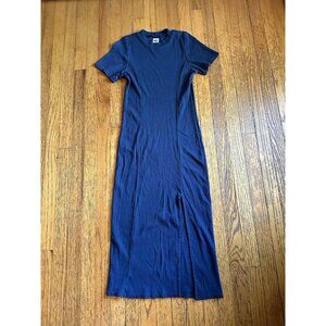 NSF Collins Ribbed Short Sleeve Midi Dress in Deep Sea Navy Blue. Cut in a bodycon silhouette, NSF's short-sleeve Collins midi-dress boasts textured ribbing and a sleek front slit. Crewneck with pullover style. Excellent used condition,