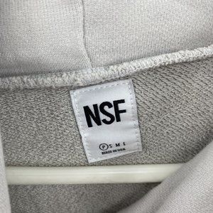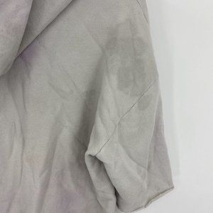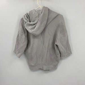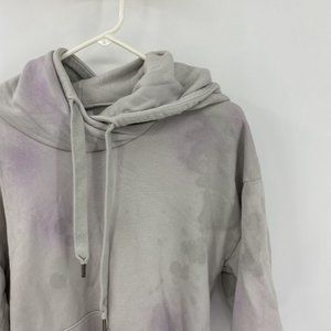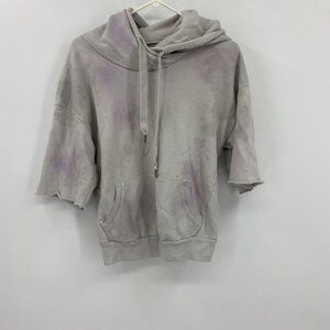 Casual gray hoodie with purple accents. Features a front pocket and drawstring hood. Relaxed fit.