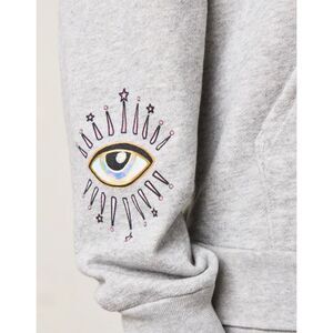 This pullover hoody has a relaxed, slightly oversized body and a unisex fit. Made in our signature garment dyed, 3 end cotton loop back French terry, it features a front kangaroo pocket and Jacquie Aiche signature artwork.