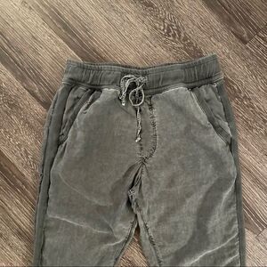 Gently worn, these are intended to have a faded worn in look to the fabric. They have side stripe detailing and a drawstring waist band.