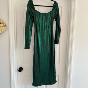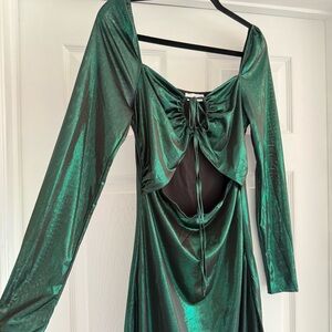 NSR Emerald Green Metallic Cutout Ruched Midi Dress Long Sleeve Party Holiday M