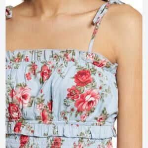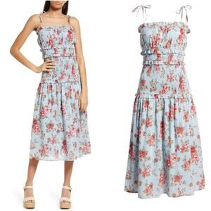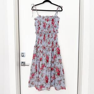 Keywords: Floral dress, smocked dress, midi dress, summer dress, sundress, romantic dress, cottagecore, garden party, wedding guest, tiered dress, tie-shoulder, blue dress, rose print, feminine, Poshmark, boho, casual, chic, sold out, baby shower, bridal shower, rehearsal dinner, ceremony, cocktail, V. Chapman