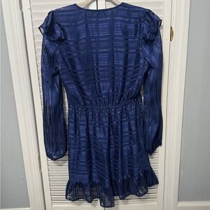 Chic royal blue dress with textured stripes. Features a stylish wrap design and long sleeves. Perfect for elegant occasions.