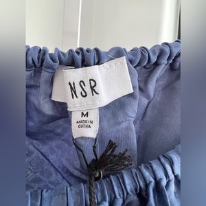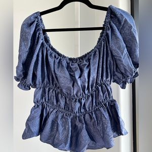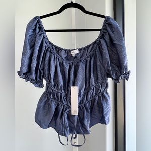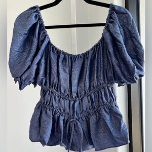 NSR - Sold at Nordstrom - Blue satin peplum top with puffed sleeves, smocking and a tie at the waist. This peasant style blouse looks great worn on or off the shoulder.