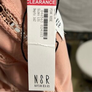 This is a pink rose lace dress with a v-neckline and a sleeveless design. It is a midi-length dress with a flowy A-line style. The dress has a pullover closure with a zipper on the side. It is lined and has a strap accent. The dress is made of lace fabric and is machine washable. It is suitable for travel, party/cocktail, and casual occasions. The dress is made by NSR and is a size L.