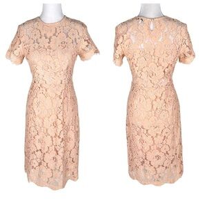 NSR tan/beige/camel allover lace dress. Fitted, sheath silhouette, short sleeves, midi length. Eyelash hem on sleeves and bottom of dress. Small keyhole back with button closure. Hidden side zip. Lined through bodice and skirt. Unlined/sheer though shoulders and at waist. So versatile! Perfect for a wedding, graduation, shower, cocktail party, night out, or other celebration. Excellent used condition: no stains, holes, or pills.