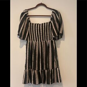 short and sweet striped dress with a smocked waist and a square neck. Allover stripes. Square neck. Short sleeves with ruffle cuffs. Ruffle hem. Lined dress.Mini length. Approx. 32" length. Imported