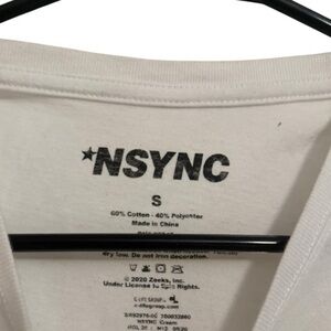 Official NSYNC graphic tee from 2020 featuring the full band lineup with colorful pop-art styling and bold “Bye Bye Bye” text. Printed on soft white cotton polyester blend. Tagged size Small. Shirt shows light general wear with a faint, hard-to-see stain on the left shoulder area. Perfect for any fan of early 2000s pop. Sold as is no cancellations or returns.