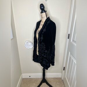 NTM: Johnny Was Black Velvet Embroidered Floral Open Front Cardigan Size M