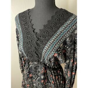 NTW Angie Women's Paisley Lace Hem Boho Floral Elastic Waist Blouse Black L
