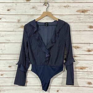NUDE Polka Dot Ruffle Long Sleeve Thong Bodysuit - Blue - Small