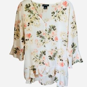 Nue Options NWOT Women’s Cream Floral Ruffle Hi-Lo Hem Blouse Size XL Flowy Top