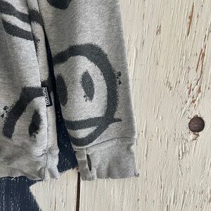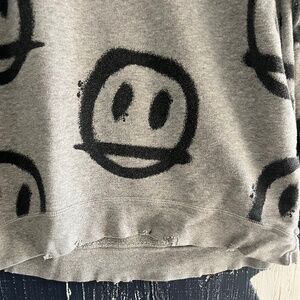 Nununu Sprayed Smiles (more like a smirk) sweatshirt. It’s quick-sprayed tagger style all over, bold, fun, comfy, slouchy, deconstructed custom torn edges and thumb holes a Nununu signature for kids coolness. Unisex