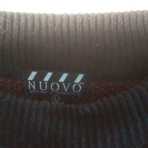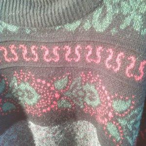Black, gray, red, and olive sweater with round neck. 85% acrylic and 15% wool. Ribbing at shoulder and 2" down on sleeve and 2" ribbed segment on front and back upper. Coordinates with design. Size L.