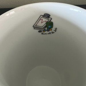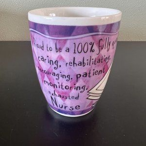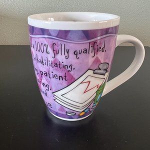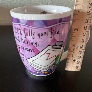 Nurses Call the Shots is the perfect mug to show your appreciation to a special nurse in your life. The wraparound design features delightful images of medical theme symbols against a diamond pattern in shades of violet and purple. Black text on one side reads, Nurses Call the Shots. The fine print reads: It’s only a job. The other side reads, Proud to be a 100% fully qualified, caring, rehabilitating, encouraging, patient monitoring, exhausted nurse. A small image of a patient chart and medications peeks out from the interior below the rim.. Microwave and dishwasher safe. Measures 4.25: tall with a 3” diameter; 4.5” across including the handle. Holds 12 fluid oz. Made of fine porcelain by History & Heraldry H & H.
