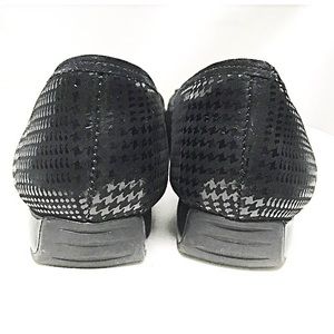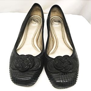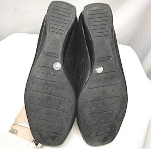 Black textured leather with bow/knot accent. SUPER cushy! A perfect shoe for looking cute and being on your feet without discomfort.