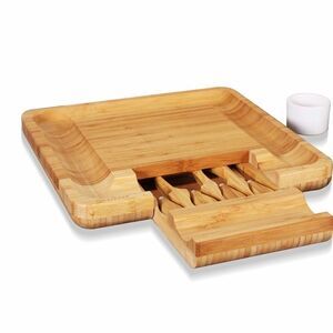 NUTRICHEF Natural Bamoo cheese board & cutlery set with drawer compartment. 100% natural bamboo cheese board set, simple serving board, cutting board design, minimalistic style & nature friendly construction, built-in-side drawer to hold utensils, grooved-edge for serving life dishes & special gatherings, great for serving guests cheese, crackers, fruits & more. Dimensions