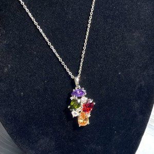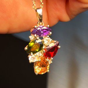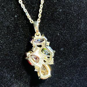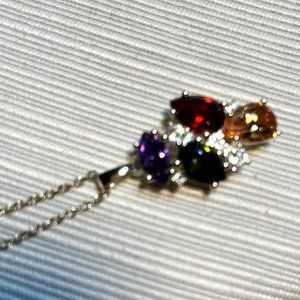 Nataliya V. Collister Necklace. Purple, green, red, clear, salmon CZs in Silver tone setting. Silver tone 16 inch chain.