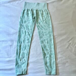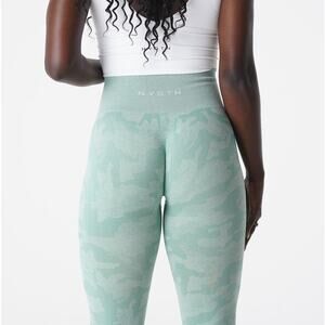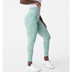 Seamless high-waisted leggings in sage green camo print by NVGTN. Made from a nylon-spandex blend with a slightly compressive waistband for a smooth, flattering fit. Full length with stretch for comfort and mobility.