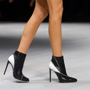 Step into bold sophistication with these stunning Saint Laurent stiletto ankle boots. Crafted in luxurious leather with a striking black and ivory colorblock design, these boots feature sharp pointed toes and sleek concealed side zippers for a clean finish.