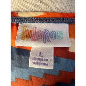 Lula Roe Large open front sleeveless cardigan in women's large size. Lightweight material with long side slits and Aztec design in shades of orange, blue, and red. Made of 100% polyester, machine washable. Made in Vietnam. Chest 24, length 44, slits 21.
