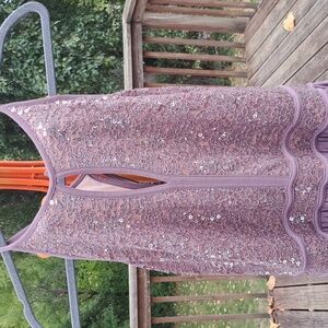 Sequin and lace bodice. Tie and 13" zipper in back.