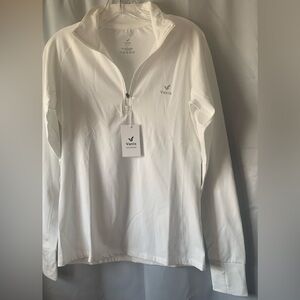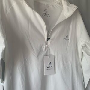 Vanis yoga jacket with thumb holes. 1/2 zip pullover. NWT but has one tiny spot please review pics carefully 4 way stretch.