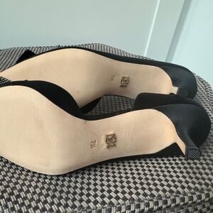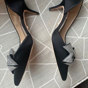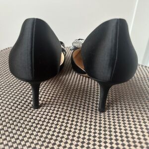 Never worn, black satin, crystal bow detail, 2.5 inch heel height