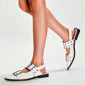 NWB CUSHIONAIRE Women 8 White Patent Silver Buckle Point Toe Flats Shoes
