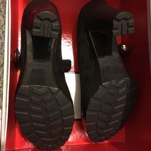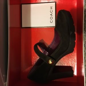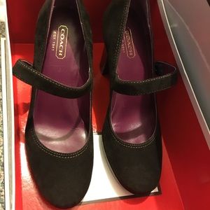 These adorable Coach Mary Jane block heels are suede leather, with leather lining. Coach is engraved on the gold snap closure on strap, embossed on inside, and stamped on rubber sole. Heel measures about 3.75". Due to the nature of suede there may be some lighter shading in some spots from being in box. Other than that these shoes are in excellent condition. They have never been worn and are in original box with care instructions. (Each shoe will be wrapped in tissue paper)