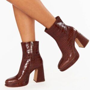 NWB Dolce Vita Lochly Croc Embossed Leather Platform Booties Brown Size 9