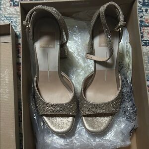 Shimmering gold block heel sandals. Stylish and comfortable. Ideal for any event.